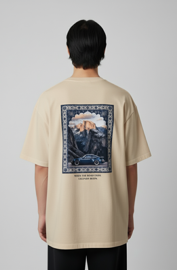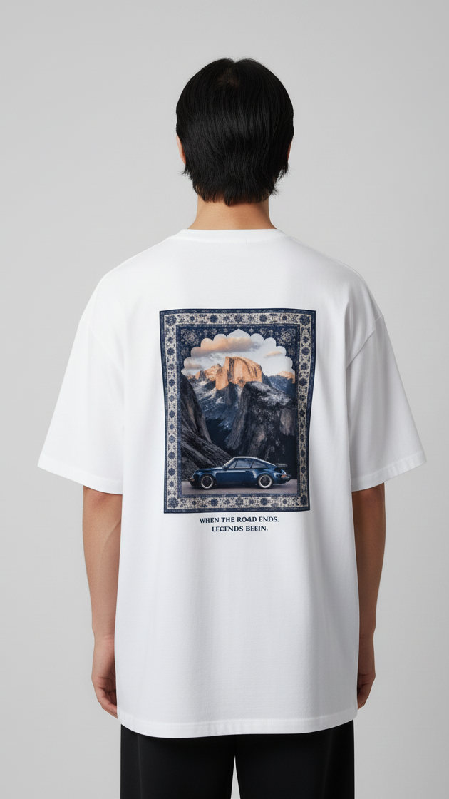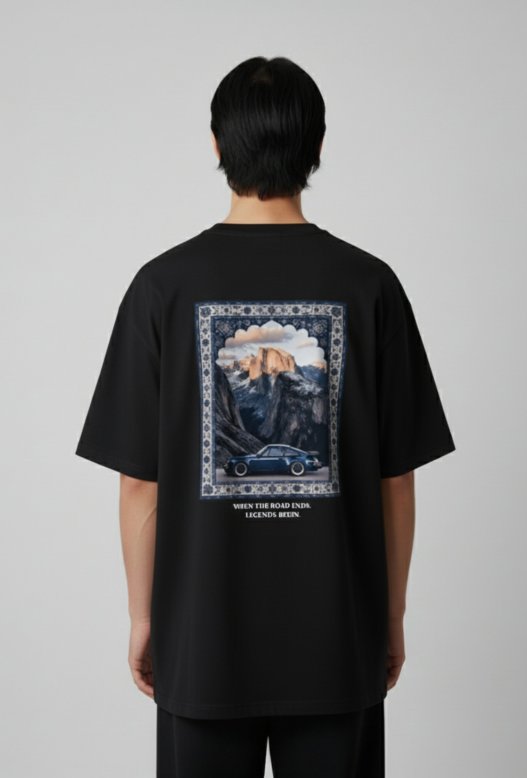 • Arka baskı – Doğa manzarasıyla birleşen ikonik Porsche 911 tasarımı + “When the road ends, legends begin.” sloganı